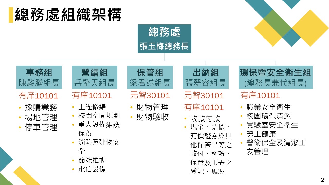 | 總務長 | 張○梅 | 一、綜理總務處各組業務工作之規劃與執行 二、督導及審核總務處各組工作規劃及預算編列 三、督導環安衛中心相關業務工作 四、校長交辦事項 |